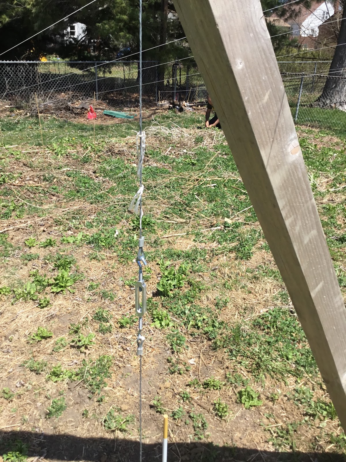 As for other infrastructure, I had none. I used no irrigation, no apparatus for seeding, weeding, or spraying. I used little to no hardware securing my trellis (two eye bolts, steel wire, aluminum stakes, and turnbuckle).